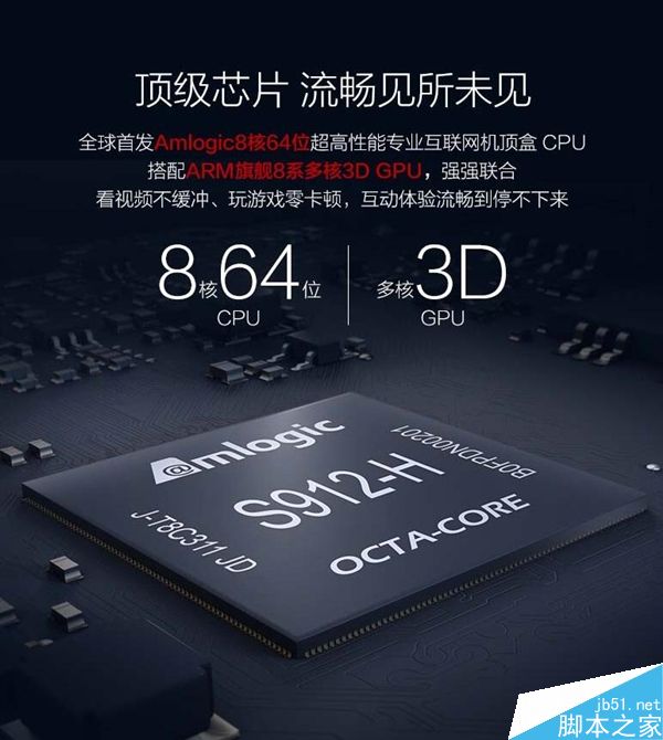 天貓魔盒3Pro被定義為新一代的旗艦級產品,搭載全球首發Amlogic S912-H八核64位處理器、采用2G內存和16G高速閃存。支持H.265硬件解碼,支持輸出真4k畫質,同時提供HDR與HLG高動態圖像范圍技術,呈現更多逼真細節。