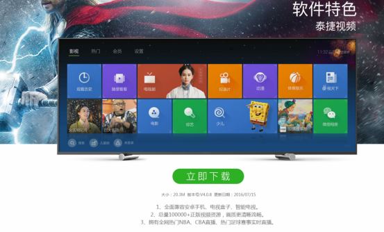 泰捷視頻擁有眾多正版獨家資源,總數超過20萬,近期的熱播劇如《小別離》、《幻城》、《誅仙·青云志》、《麻辣變形記》,電影《大唐玄奘》、《老炮兒》等,都在泰捷視頻獨家首播或獨播,喜歡的朋友請趕快下載觀看!