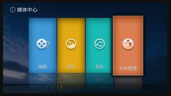 1、首先,在泰捷視頻官網下載好最新的安裝包,轉移到U盤里。然后將U盤插入到酷開電視的USB岔口,在電視主菜單頁面找到【媒體中心】,點擊進去就能在【文件管理】界面找到你的U盤。