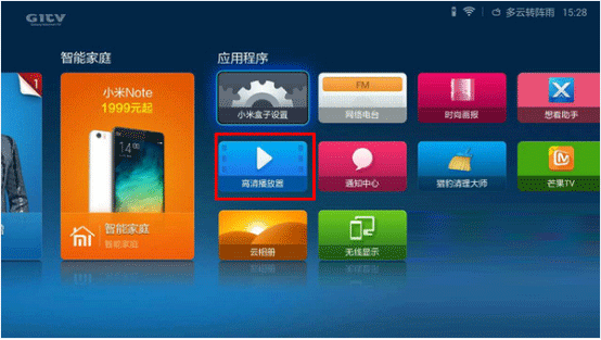 第二步:在系統主界面菜單里找到【高清播放器】,然后在【設備】欄目里找到你U盤里的文件,點擊安裝“云視聽.泰捷”安裝包。
