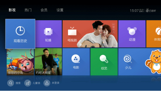 功能:輪播臺、電視劇、綜藝節目、紀錄片、少兒專區、動漫、紀錄片、體育娛樂(NBA|CBA、演唱會直播)、新聞板塊