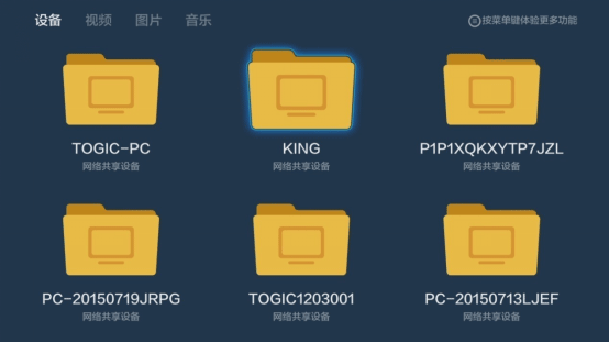 第二步:然后再到小米盒子系統主界面菜單里找到【高清播放器】,然后在【設備】欄目里找到你局域網里剛剛共享文件夾電腦設備的名稱,點擊安裝“電視家2.0”