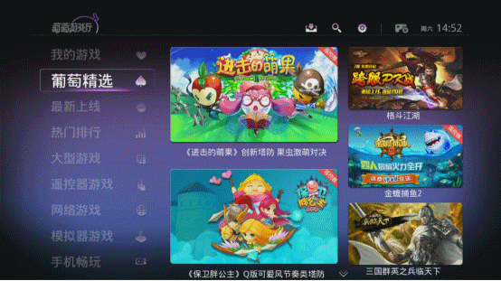 葡萄游戲廳tv版是免費的智能電視游戲平臺。提供帶數據包的大型智能電視游戲、智能電視單機游戲、智能電視雙人/多人游戲和智能電視網絡游戲!專為安卓智能電視及智能機頂盒打造的游戲中心。