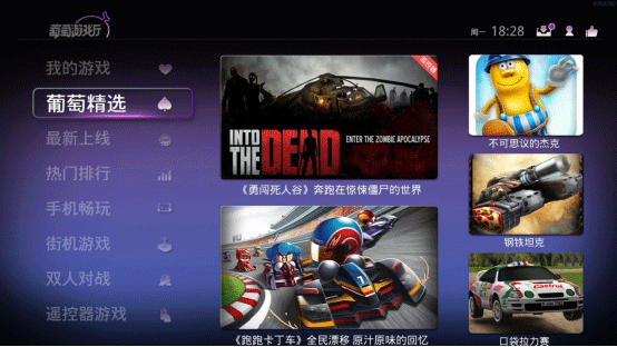 葡萄游戲廳:在電視上面,你除了看電視其實還可以玩游戲,這款軟件能夠兼容大型智能電視,電視盒子等等,專心為安卓類的設備打造上千款的熱門游戲,3D游戲街機游戲應有盡有,只需要再給你的設備增加游戲手柄就可以了。