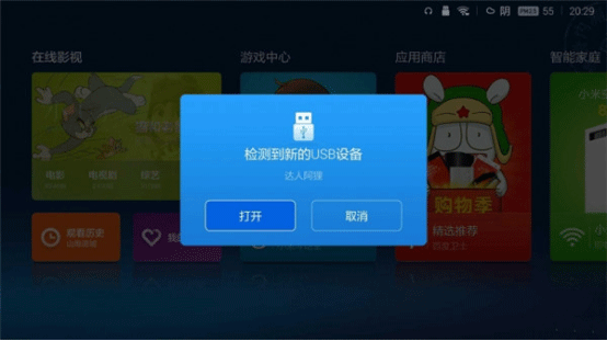 第二步:盒子接通電源后,直到打開了盒子系統界面,這時候你就可以把U盤給插上了,過不一會就會跳出一個菜單欄選項。