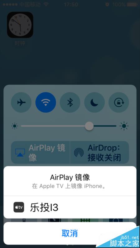 2、然后是iphone或ipad的操作,手持終端向上拉就會彈出菜單,按照圖中標識選擇AirPlay鏡像;在新打開的窗口中就會彈出選項,然后選擇”樂投”。就完成連接了。