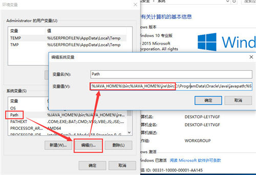 c、接下來(lái)在win10系統(tǒng)變量了找到Path這個(gè)變量,Path變量不用新建,系統(tǒng)原本就有,我們只需要找到它點(diǎn)“編輯”,如下圖所示: