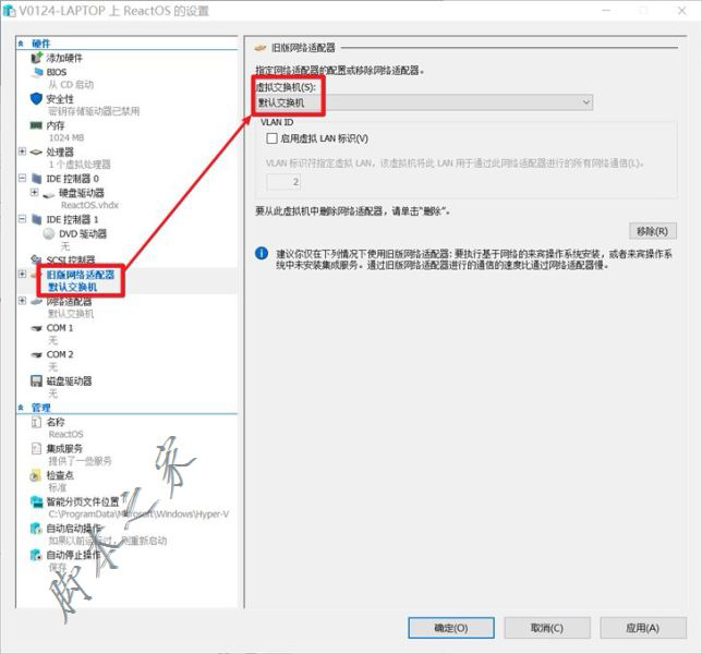 添加好之后,右側(cè)就會(huì)出現(xiàn)一個(gè)舊版網(wǎng)絡(luò)適配器,然后為它選擇一個(gè)虛擬交換機(jī),筆者這里選擇默認(rèn)交換機(jī)。單擊確定應(yīng)用更改并關(guān)閉設(shè)置。