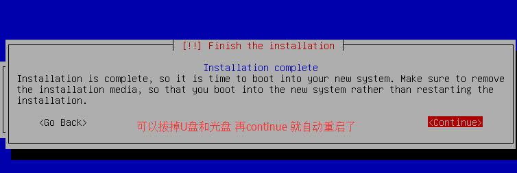 可以拔掉U盤與 光盤 再continue 就自動重啟了