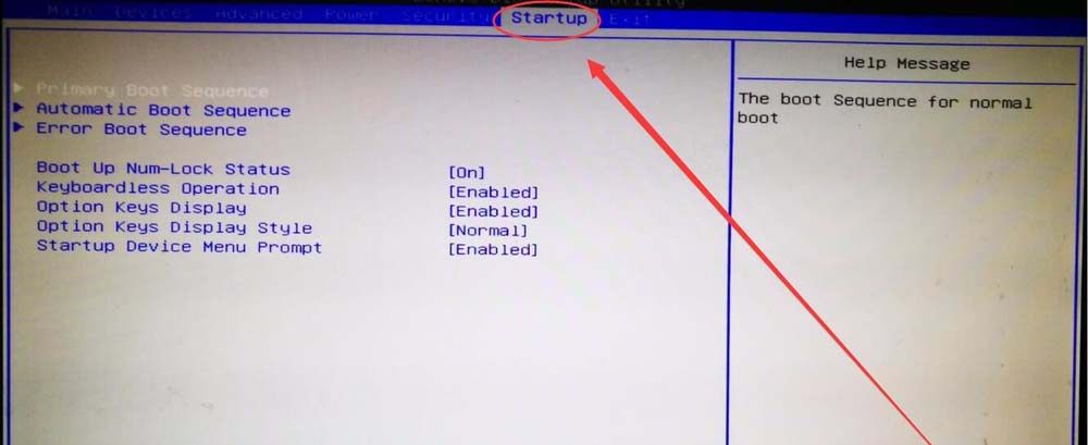 2、進入CMOS界面后,用鍵盤上的左右鍵選擇Startup選項。