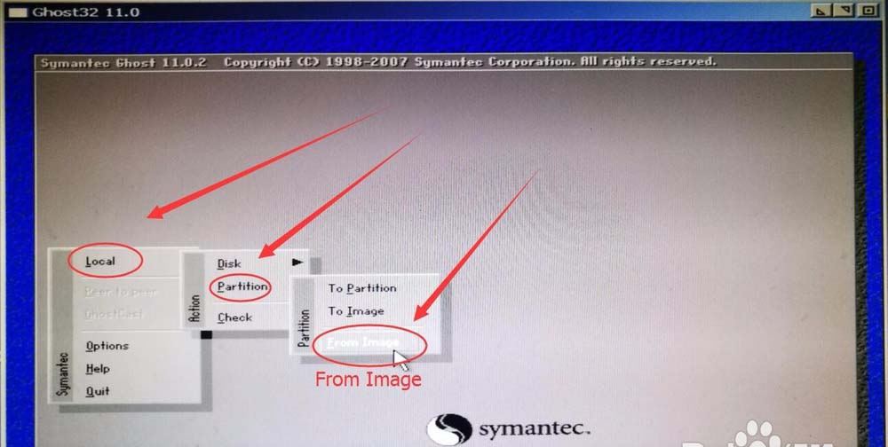 3)打開Ghost后,選擇Local---->Partition---->From Image選項,如下圖所示。