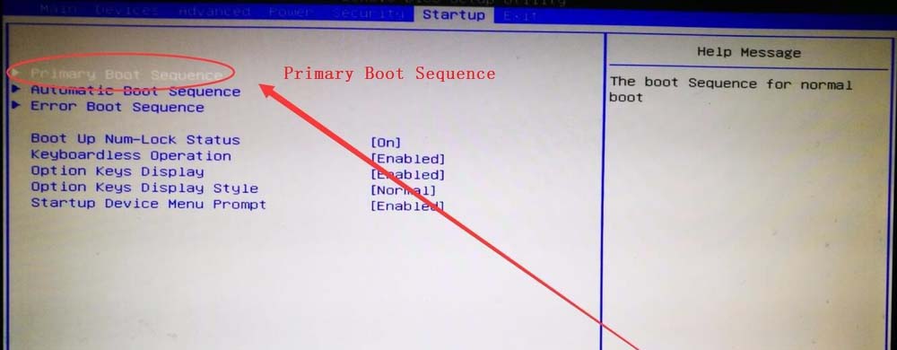 3、選擇第一項Primary Boot Sequence選項,在鍵盤上按下回車鍵。