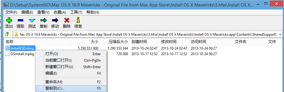 2.進入Install OS X Mavericks文件夾,用7-zip打開名為”5.hfsx“的文件,按照路徑 “Install OS X Mavericks/Install OS X Mavericks.app/Contents/SharedSupport/”找到“InstallESD.dmg",把它提取出來(注意這個步驟的InstallESD.dmg并不是我們最終需要的InstallESD.dmg)。