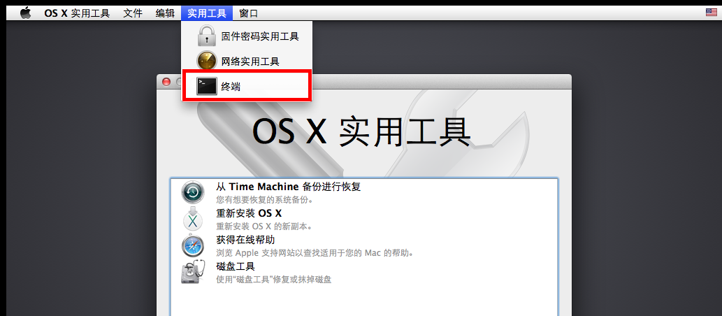 3.點擊紅色的圈圈,關閉“磁盤工具”,回到“OS X 實用工具”頁面。在最上方的菜單欄中點擊”實用工具“,打開”終端“。