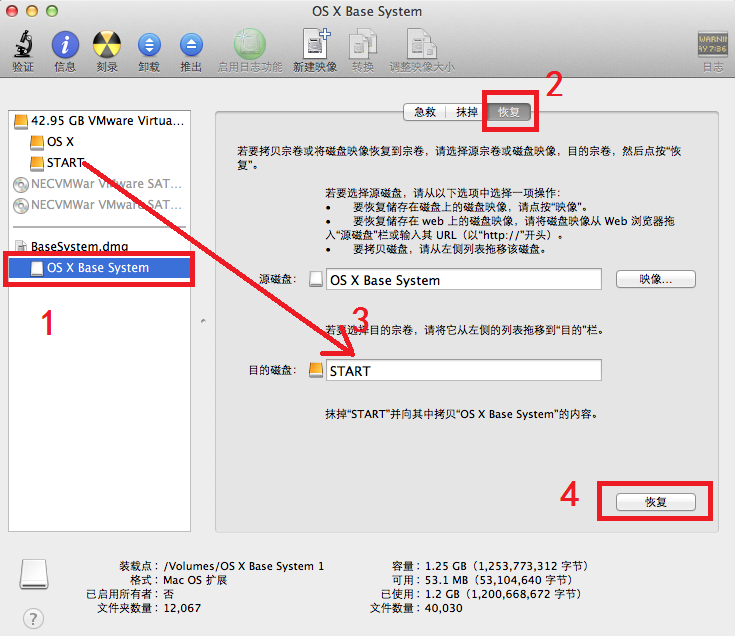 10.把OS X Base System中的內容恢復到START分區中:選中OS X Base System,點擊“恢復標簽頁”,把START分區拖移到“目的磁盤”處,點擊“恢復按鈕”。系統會提示你什么START上的數據會被抹掉啊之類的,直接點擊“抹掉”。
