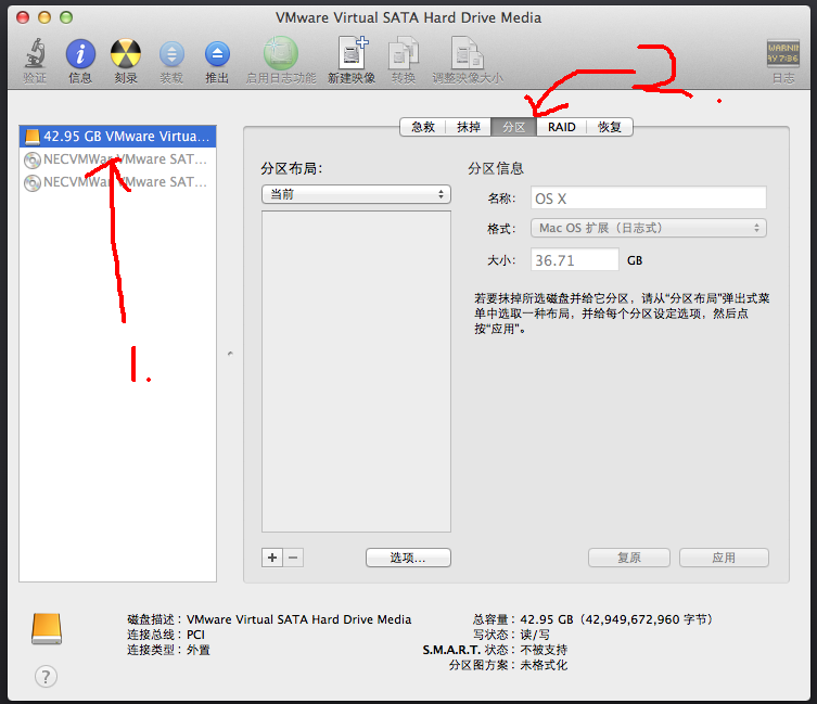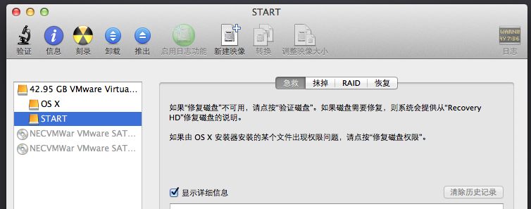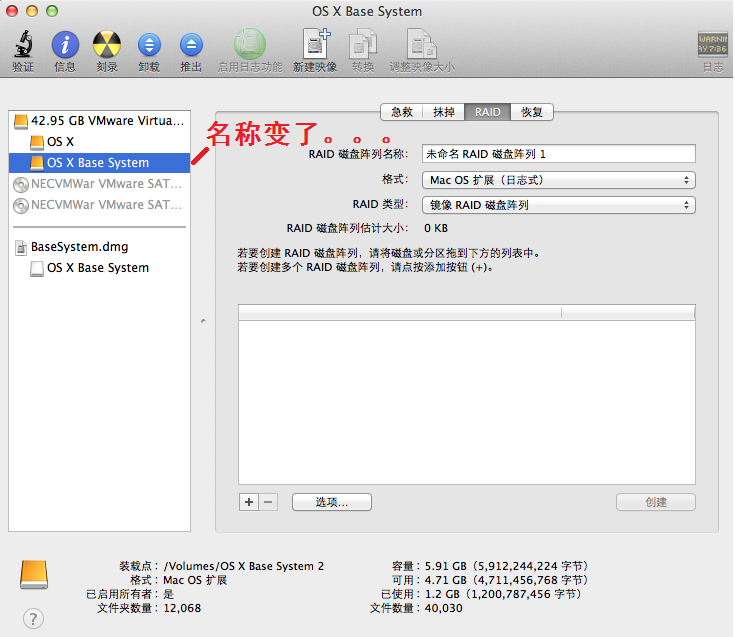 一切都配置完以后,關閉OS X系統。在“編輯虛擬機設置”中把CD/DVD 2移除掉,把CD/DVD的連接設置為“使用物理驅動器”。啟動OS X系統,點擊Lunchpad,在“其他”中有個“磁盤工具”,使用“磁盤工具”把OS X Base System抹掉。