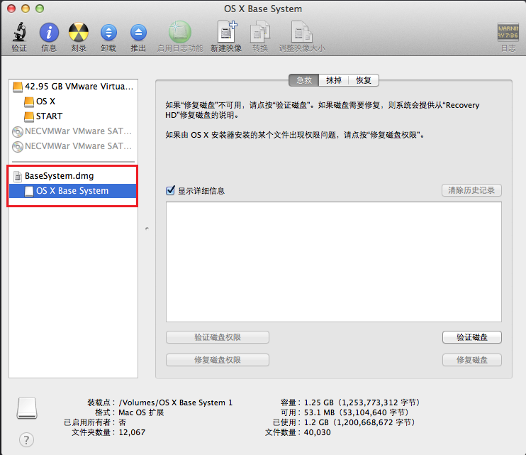 9.再次點擊“磁盤工具”進入磁盤工具頁面。會發現左邊多了一個叫OS X Base System的東西。