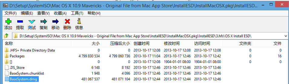 6.使用7-zip打開”3.hfs“,里面有個OS X Install ESD目錄,進入這個目錄后,就找到BaseSystem.dmg了,把它提取出來。