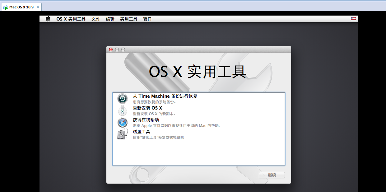 15.退出控制臺(不要點擊紅色按鈕,而是使用菜單欄上的��單退出),系統切換到“OS X 實用工具”頁面。