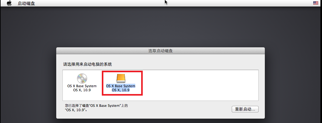 17.點擊“選取啟動磁盤...”,等待幾秒后,系統會彈出“選取啟動磁盤”對話框,選擇黃色硬盤符號的OS X Base System OS X, 10.9,點擊“重新啟動...”按鈕。系統會問你要不要重啟。廢話,肯定重啟呀!