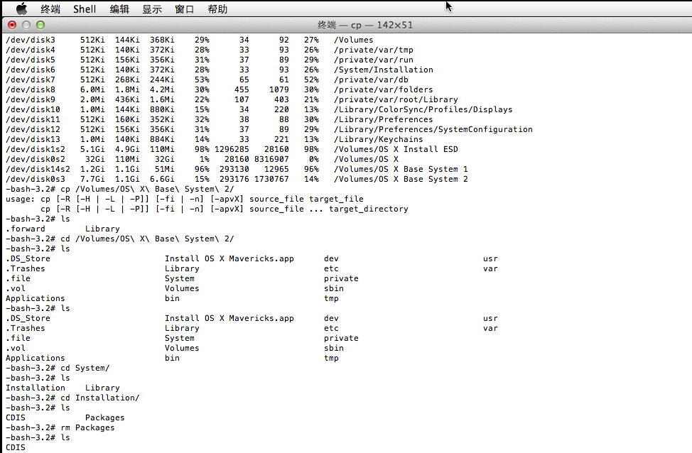 執行命令“cd /Volumes/OS/ X/ Base/ System/ 2/System/Installation”進入到Installation目錄中。執行命令“rm Packages”,刪除Packages文件。