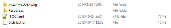 1.在Install OS X Mavericks.dmg上點擊右鍵,選擇7-zip->提取到“Install OS X Mavericks/"。等解壓完后,就會得到一個名為Install OS X Mavericks的文件夾,文件夾中的內容如下圖所示。
