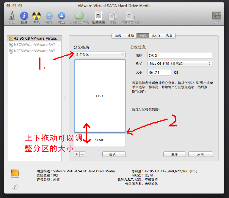 2.點擊“分區布局”中的下拉框,選擇你所需要的分區數量,并調整每個分區的大小。以分兩個區為例:我們設置啟動分區為8G,并修改其名稱為“START”,主分區為34G,名稱為“OS X”。點擊“應用”,系統會提示你是否要分區,點擊“分區”。
