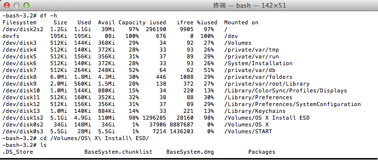 6.輸入“ls”并回車,檢驗是否進入/Volumes/OS X Install ESD目錄。目錄中的文件如下: