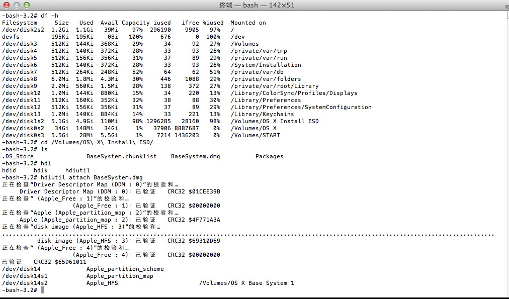 7.掛載BaseSystem.dmg:輸入命令“hdiutil attach BaseSystem.dmg”并回車。