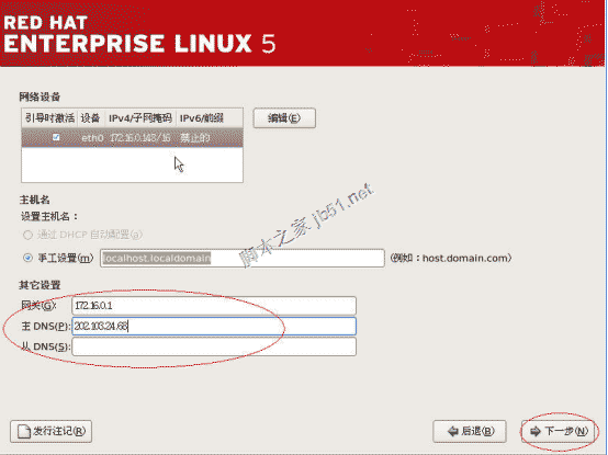 選擇默認“GRUB引導裝載程序將會倍安裝在/dev/sda上”,點擊“下一步”,進入網絡配置界面,如圖16所示。