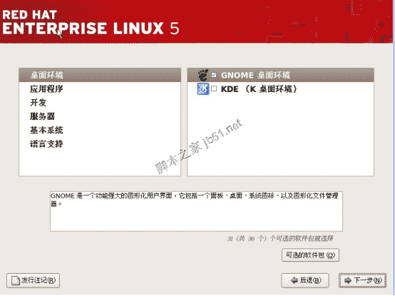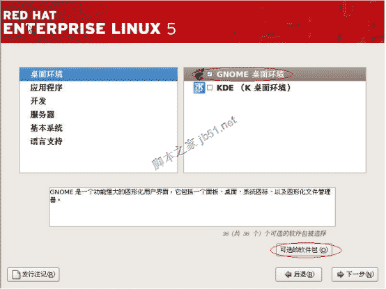 桌面環境這一項,只選擇“GNOME桌面環境”,選中“GNOME桌面環境”,點開下方“可選的軟件包”,把沒勾上的全勾上。如圖24所示。