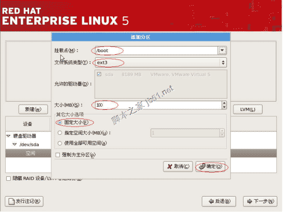 首先新建一個分區,掛載點為“/boot”,文件系統類型為“ext3”,大小為默認的“100”MB,點擊“確定”,如圖11所示。