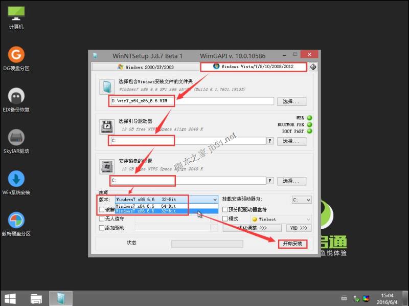 6、按下圖順序選擇WIM格式鏡像、安裝位置與想安裝的版本(x86或x64)