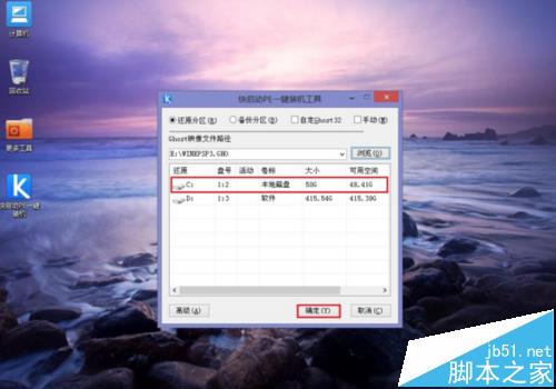 2、隨后進入到快啟動pe系統桌面,將U盤啟動盤根目錄下的ghost xp系統添加到自動彈出的快啟動裝機工具中,選擇c盤作為系統安裝路徑,點擊“確定”按鈕開始重裝,如下圖所示: