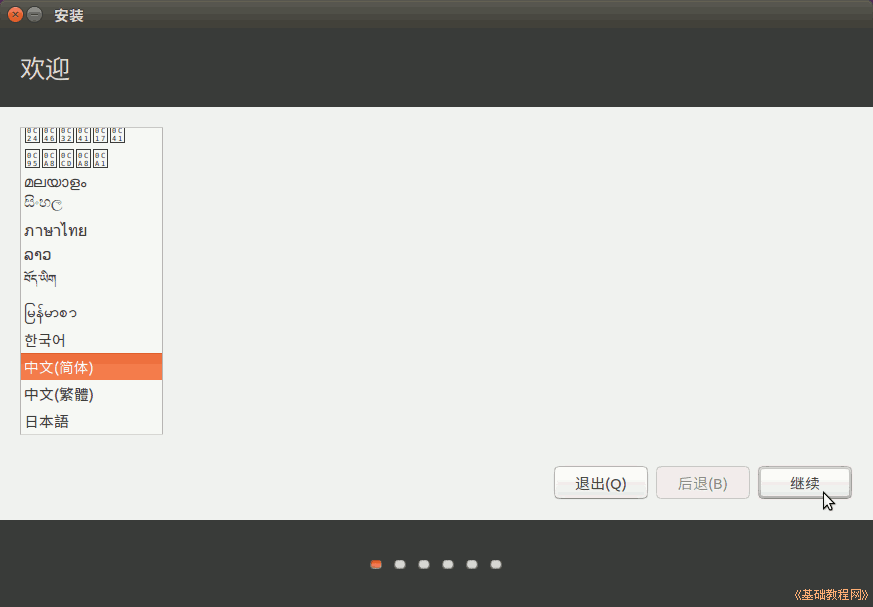1)雙擊桌面“安裝Ubuntu16.04 LTS”圖標,稍等出來一個“歡迎”面板,檢查一下左側欄要選中了“中文(簡體)”,