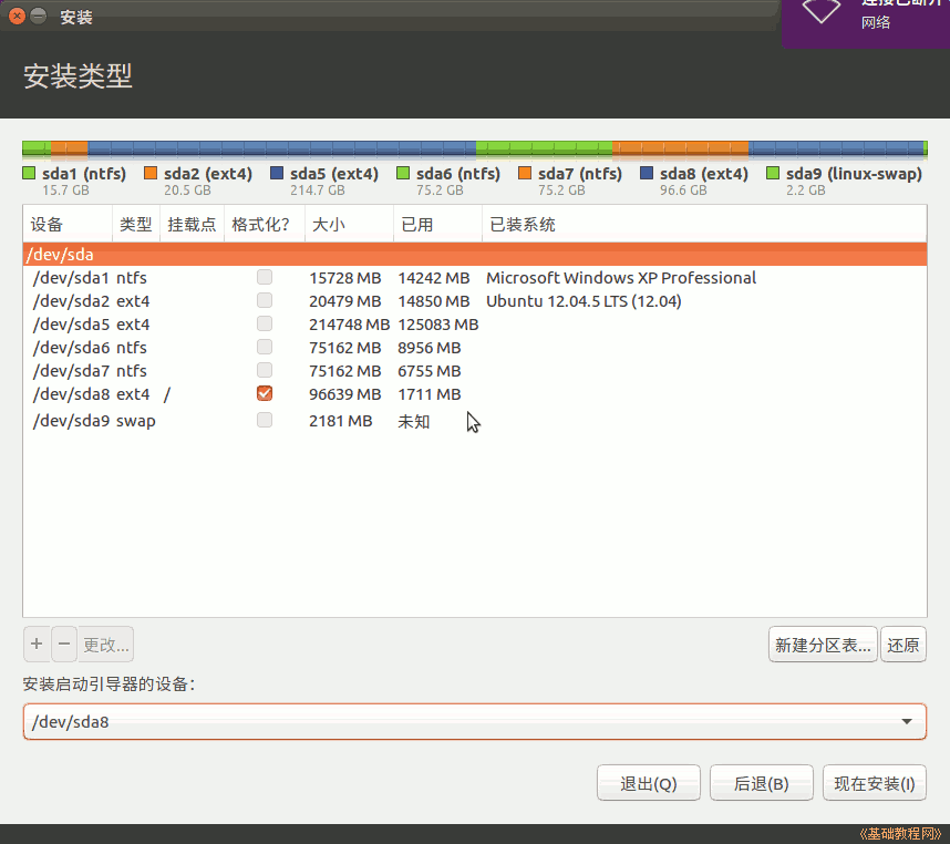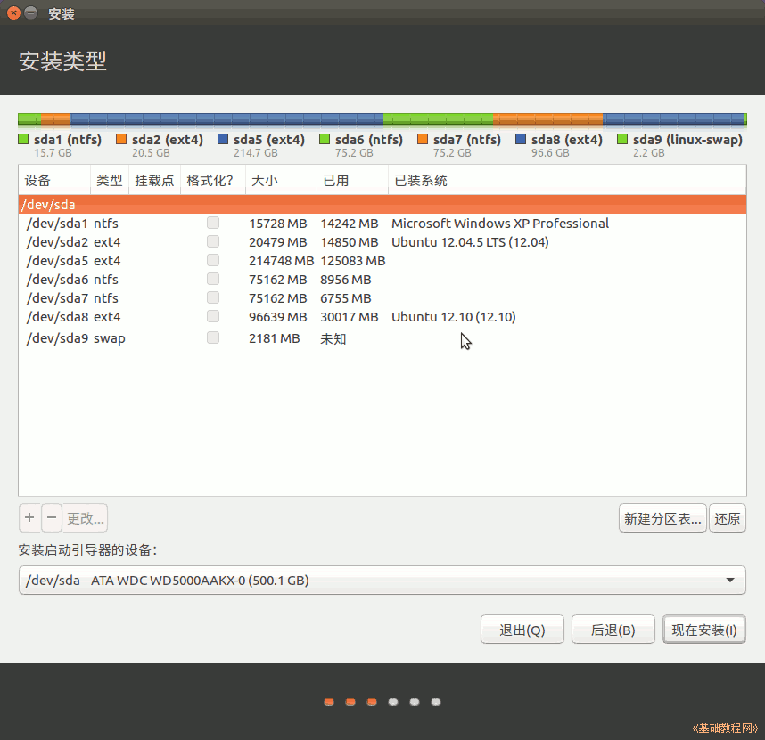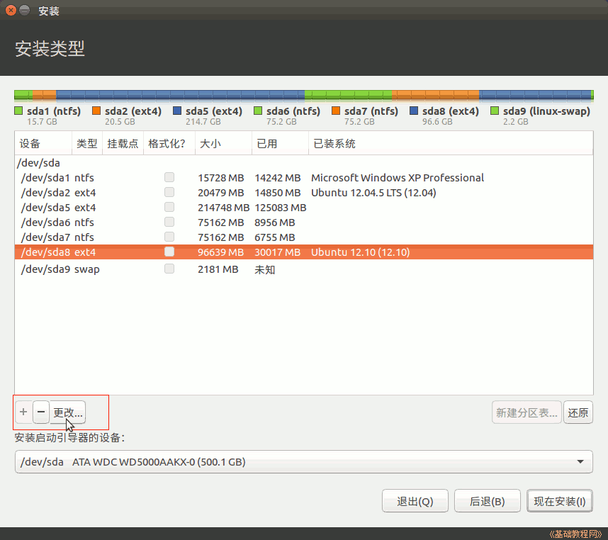 4)接下來出來磁盤分區情況,如果要新建分區和轉換分區可以參考前面的第7、13、15、16、19課,這兒是安裝到之前12.10的Ext4分區上;