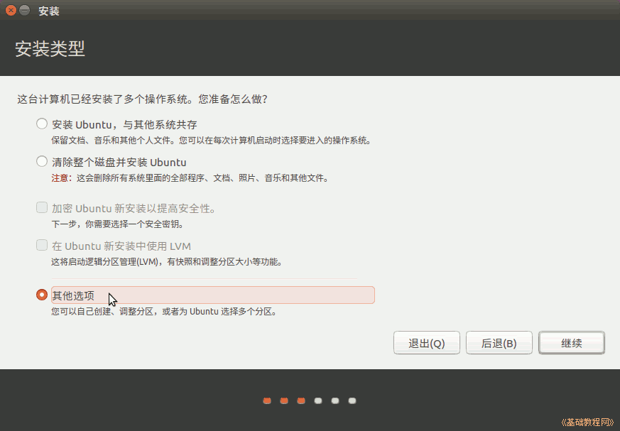 3)接下來第3步是詢問安裝到哪個分區,選擇最下邊的“其他選項”,點“繼續”按鈕;