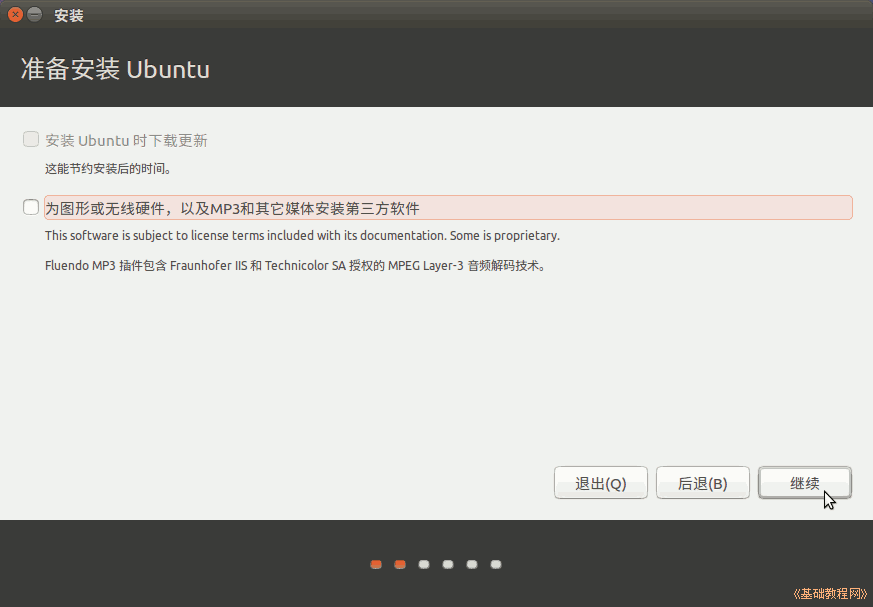 2)第2步是檢查準備情況,要求磁盤空間足夠,不要連接網絡,一般不勾選更新和第三方軟件,直接點“繼續”按鈕;