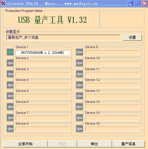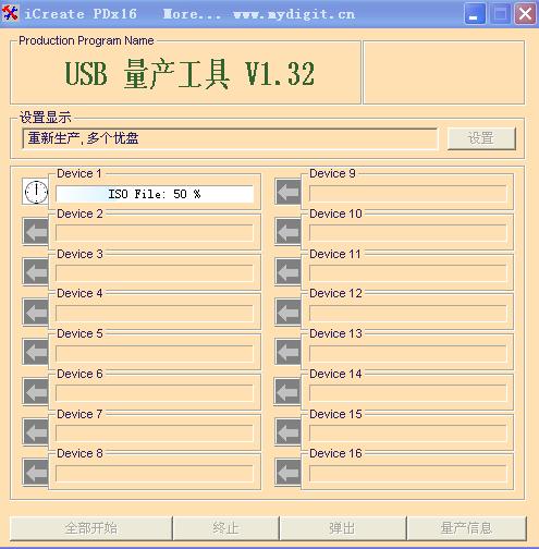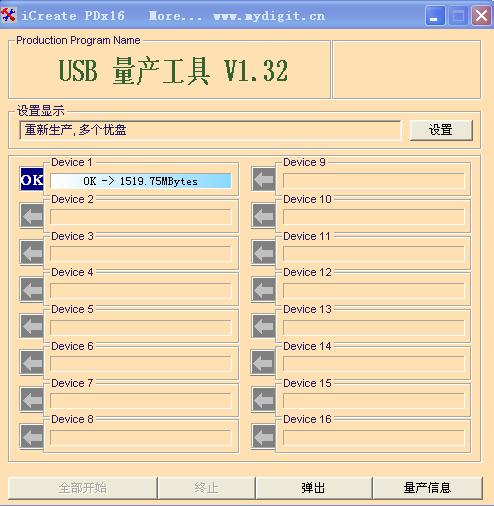 現在就設置好量產該設置的參數了,全部檢查一遍,看有沒有誤設置的地方,確認無誤后,點確定,回到程序主界面,這時在主界面的"設置顯示"中會顯示"重新生產,多個優盤",點擊下面的全部開始,開始量產,如圖: