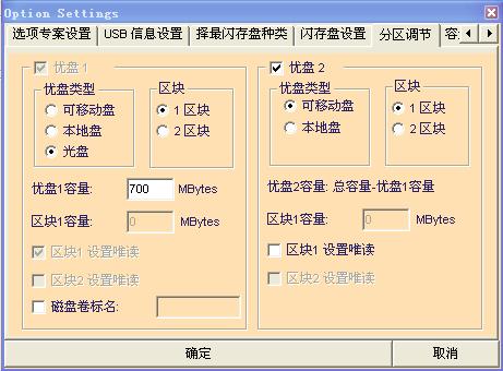 設置完閃存盤設置后, 選擇'分區調整':優盤1中在優秀類型選擇"光盤",然后設置優盤2,這樣我2G的U盤不可能只生成一個CD鏡像,這樣浪費空間,所以可以再生產一個可移盤或本地磁盤出來,在'分區調整'中在"優盤2"打勾,選擇區塊1,再在優盤1中的"優盤1容量"輸入700,這樣就設置和分區的各項了,如圖: