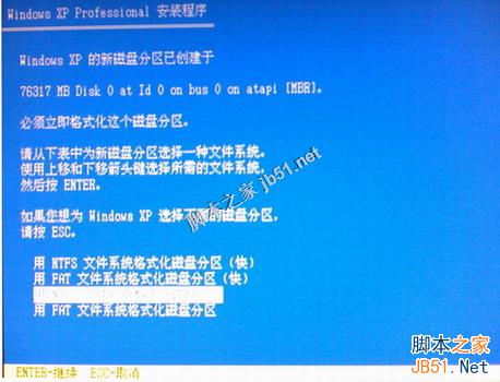 按ENTER鍵后屏幕提示格式化分區,此時我們使用上下方向鍵選擇用FAT文件系統格式化磁盤分區(快),然后按ENTER鍵,如下圖: