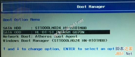 4、在計算機重新啟動至LenovoLOGO畫面時,并按下筆記本鍵盤上的Fn鍵+F12鍵進入筆記本的引導設置界面(或者請您在計算機重新啟動至Lenovo LOGO畫面時按下筆記本的電源開關關閉計算機之后,按下一鍵恢復按鈕開機,按下鍵盤上按鍵選擇啟動菜單中的Boot Menu項目之后按下回車鍵進入引導設置界面)。在此時將您筆記本的光驅托盤彈出,放入正版的Windows 7操作系統光盤之后將光驅托盤推回,同時選擇該界面中的SATA ODD(是使用光驅進行安裝系統)或USB ODD(使用外接的USB的U盤進行安裝系統)并按下回車鍵,以實現引導啟動。