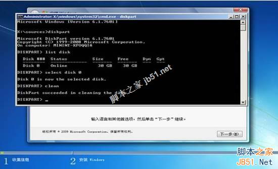 5、輸入clean命令并按下回車鍵來請除您筆記本的硬盤中的所有分區及數據。