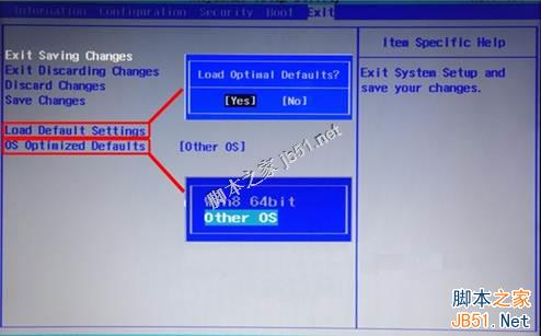 2、進入BIOS設置界面后,按下鍵盤上鍵將菜單移動至EXIT項目,按下鍵盤上按鍵選擇到OS Optimized Defaults選項,按下回車鍵打開該選項的設置菜單,按下鍵盤上按鍵,將該選項默認的Win8 64bit修改為Others之后,按下回車鍵確認。之后按下鍵盤上按鍵選擇到Load Default Setting選項,按下回車鍵啟動恢復BIOS默認功能窗口,在該窗口中直接按下筆記本鍵盤上的回車鍵啟動BIOS恢復默認功能。之后再按下筆記本鍵盤上Fn鍵+F10鍵啟動BIOS保存設置窗口,在該窗口中直接按下筆記本鍵盤上的回車鍵啟動BIOS保存設置并重新啟動計算機。