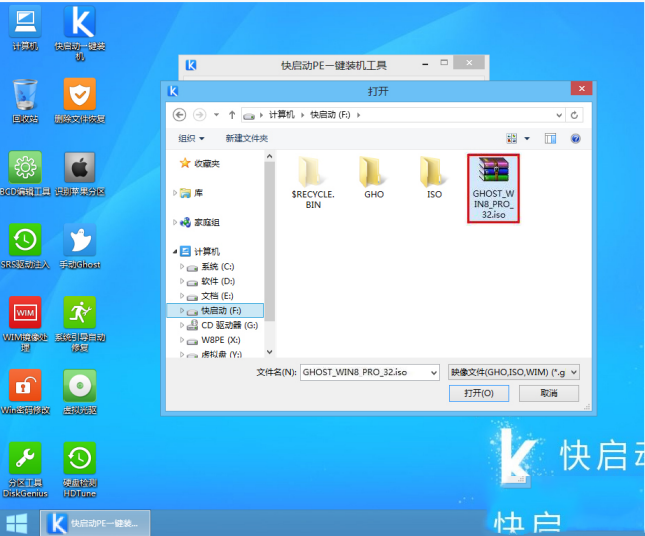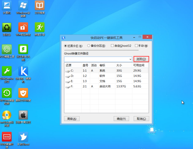 進入快啟動win8pe系統后會自啟快啟動一鍵裝機工具,在工具界面點擊“瀏覽”按鈕,如下圖所示: