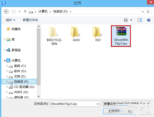 在打開窗口左側列表中點擊u盤,選擇我們要安裝的GHOSTXP系統鏡像文件,如果下載的是ISO格式的鏡像文件,無需解壓直接選擇就可以,我們的程序會自動加載并識別GHO文件的,然后繼續點擊“打開”按鈕,如下圖所示: