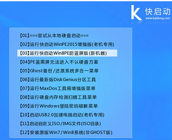 進入到快啟動的主菜單界面后,用鍵盤上的上下鍵將光標移至“【03】運行快啟動Win8PE防藍屏版(新機器)”并回車確定,如下圖所示