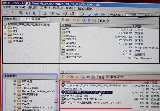 然后在下圖藍框處找到你放置win7原版鏡像的文件夾路徑,在紅框里找到win7鏡像文件,雙擊鼠標左鍵打開,就會出現(xiàn)黑框里的信息