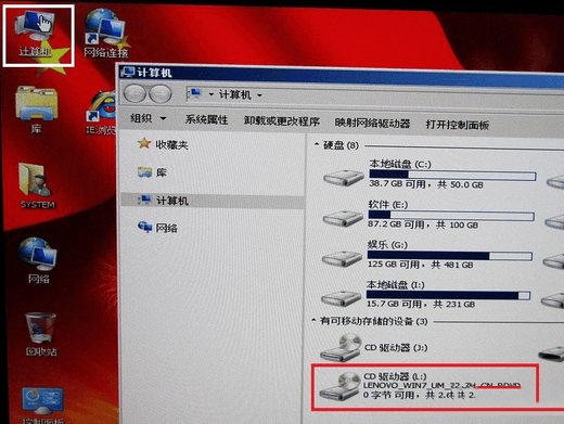 然后關(guān)掉軟碟通,再點下圖白色框“計算機”,就會彈出一個窗口,在下圖紅框處,我們可以看到一個虛擬光驅(qū)加載了一個光盤鏡像了