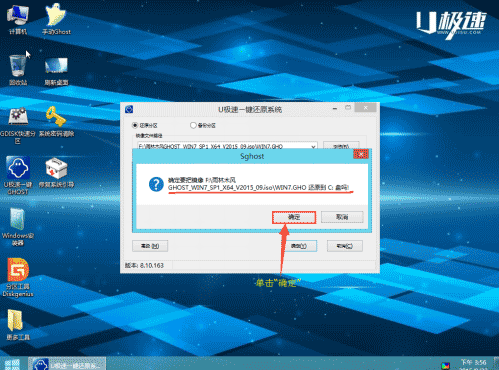 進(jìn)入PE系統(tǒng)后,會(huì)自行彈出PE系統(tǒng)自帶的系統(tǒng)安裝工具"U極速一鍵還原系統(tǒng)",裝機(jī)工具將會(huì)自動(dòng)加載系統(tǒng)鏡像包所需的安裝文件,我們只要選擇安裝的磁盤(pán)分區(qū),接著點(diǎn)擊"確定"按鍵,如下圖所示: